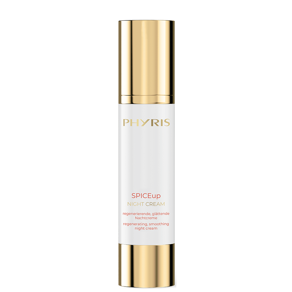 PHYRIS SPICEup Night Cream е регенериращ и изглаждащ нощен крем за лице с богата и немазна текстура. Отпуска мимическите бръчки и успокоява стресираната кожа. Богатата му текстура се абсорбира в кожата мигновено, оставяйки я копринено мека. Мощните съставки напомнят на богат базар за подправки – сечуанският пипер отпуска бръчките и успокоява кожата, като по този начин спомага за мигновено и трайно намаляване на признаците на стареене. Маслото от кориандър се грижи за кожата и осигурява подхранване в дълбочина.