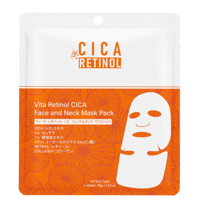 Mitomo CICA Vita Retinol Face and Neck Mask Pack е реструктурираща и подмладяваща маска за лице и шия с комплекс от CICA и ретинол, известни със своите хидратиращи и ревитализиращи свойства. Богатата есенция от маската прониква дълбоко в кожата, като ѝ осигурява интензивна хидратация и я снабдява с жизненоважни хранителни вещества.