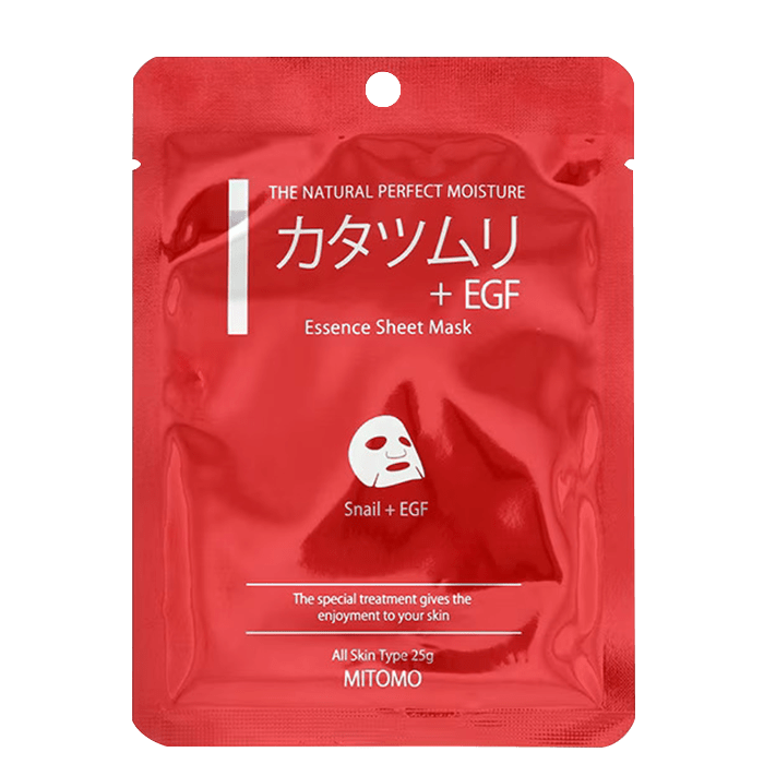 Маската Mitomo Snail + EGF съдържа екстракт от охлюви и EGF. Епидермалният растежен фактор насърчава регенерацията на увредените клетки и образуването на нови клетки. Той също така осигурява интензивно незабавно и непрекъснато хидратиране на сухата и чувствителната кожа. Екстрактът от слуз от охлюви (охлювен филтрат) е пълен с хранителни вещества като хиалуронова киселина, гликопротеин протеогликани и антимикробни и медни пептиди. Охлювният муцин е най-известен със своите свойства против стареене. Стимулира образуването на колаген и еластин предпазва кожата от свободните радикали, успокоява кожата, възстановява увредените тъкани и хидратира в дълбочина. Шийт маската е с най високо качество и е изработена от натурални растителни фибри от бамбук.