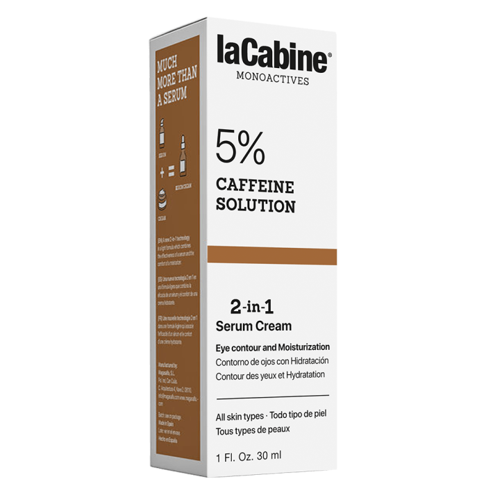 Кофеинът е естествено срещано вещество, известно със своите тонизиращи свойства. Интензивно стимулира кожната циркулация и свиването на кръвоносните съдове. Има дрениращ ефект и спомага за разграждането на мастните натрупвания. Действа като свива мастните клетки и изтегля водата от тях и по този начин намалява торбичките и тъмните кръгове. Стягащият му ефект видимо намалява подпухването и признаците на умора под очите. Свойството му да стимулира притока на кръв към съответната зона води до изсветляване на тена, като помага да избледнеят кръговете около очите. Подобрява структурата и спомага за намаляване на фините линии и бръчките. Това води до видимо по-отпочинал и релаксиран вид на кожата.