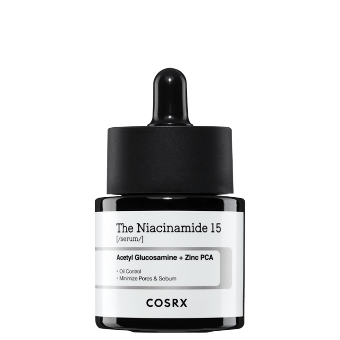 Cosrx The Niacinamide 15 Serum е серум за лице с 15% ниацинамид, който ефективно противодейства на появата на несъвършенства по кожата, регулира омазняването и производството на себум, както и появата на черни точки. Съдържа PCA цинк, който има антибактериален ефект, както и трехалоза, отговорна за хидратацията на кожата и ефективната защита от свободните радикали.