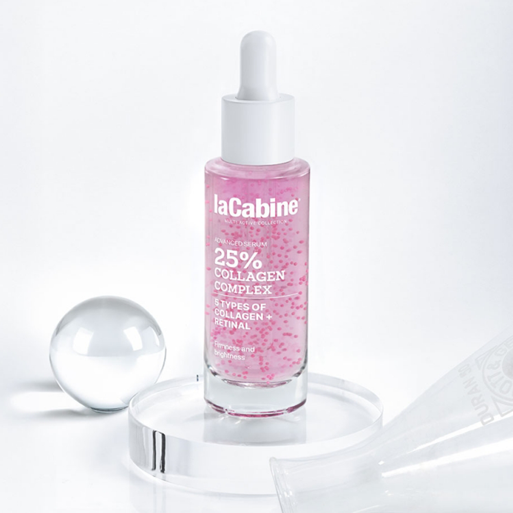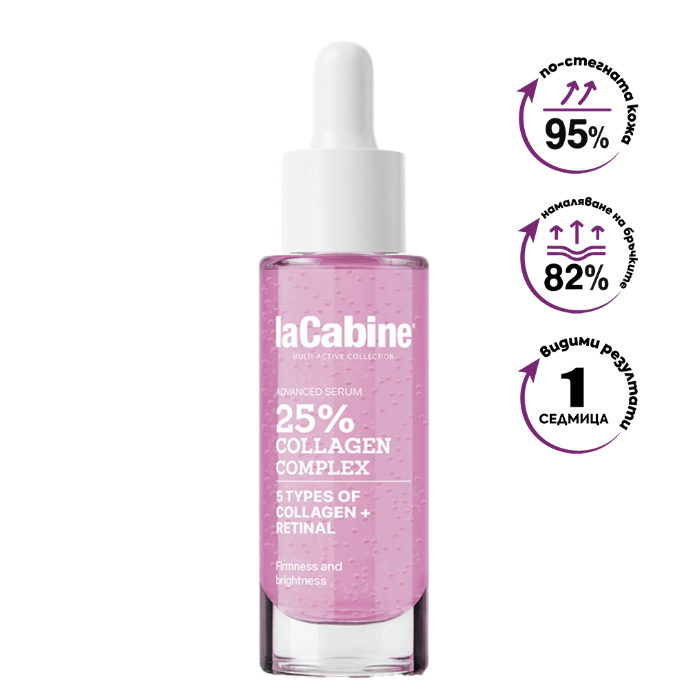25% Collagen Complex Advanced Serum съдържа висока концентрация на активни съставки - 25% колаген комплекс, ретинал и микросфери с 5 вида витамини.