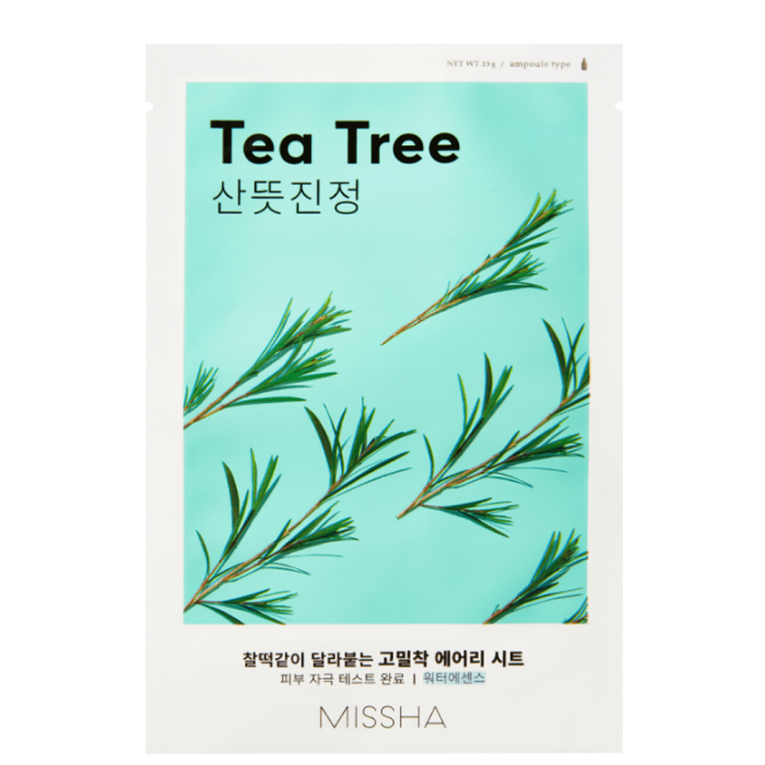 MISSHA Airy Fit Sheet Mask Tea Tree е текстилна шийт маска за лице с екстракт от чаено дърво, подходяща за суха кожа. Успокоява раздразненията и зачервяванията, хидратира чувствителната кожа и помага при розацея, пъпки и акне. Създадена от екологично чиста материя, която осигурява комфорт и прилепва към контурите на лицето. Оризовата хартия на маската е два пъти по-тънка от нормалната хартия, поради което маската се усеща като втора кожа.