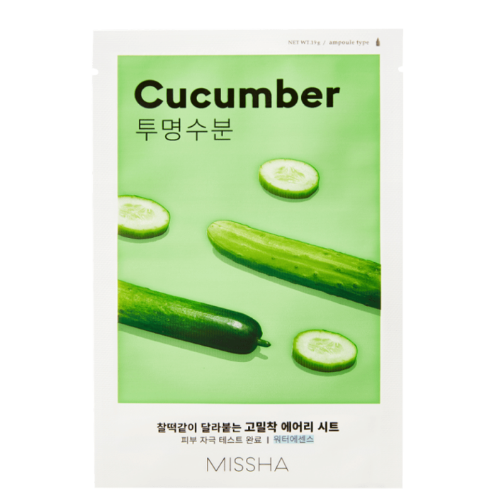 MISSHA Airy Fit Sheet Mask Cucumber е текстилна шийт маска за лице с екстракт от краставица. Хидратира, подхранва и поддържа кожата чиста и освежена. Създадена от екологично чиста материя, която осигурява комфорт и прилепва към контурите на лицето. Оризовата хартия на маската е два пъти по-тънка от нормалната хартия, поради което маската се усеща като втора кожа. Екстрактът от краставица се извлича при ниска температура, което запазва чистотата и ефикасността на съставката.