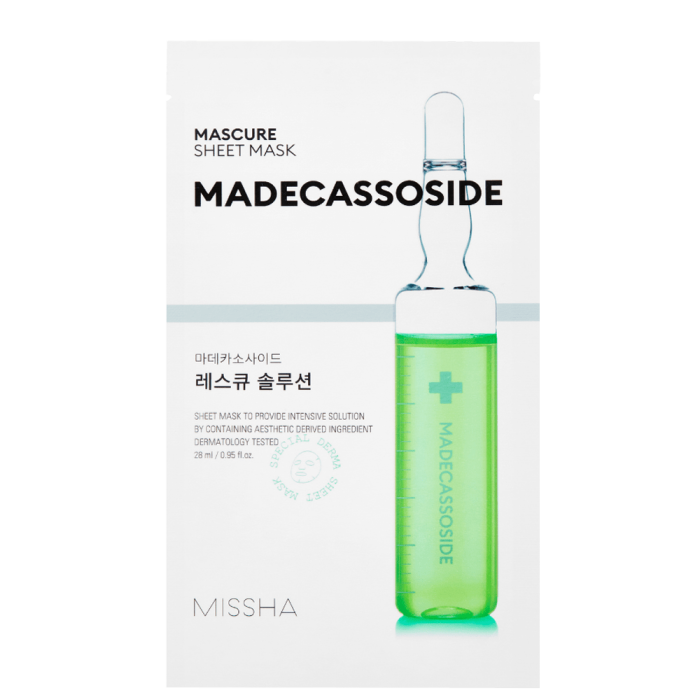MISSHA Mascure Rescue Solution Sheet Mask Madecassoside е шийт маска за лице с мадекасозид и хипоалергенна формула, подходяща дори за най-чувствителната кожа. Подпомага ефективното възстановяване на кожата, поддържа оптималните нива на влага, успокоява и изглажда текстурата. Материалът на шийт маската осигурява нейното перфектно прилепване към контурите на лицето, което подпомага максималното усвояване на активните съставки.
