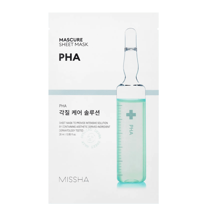 MISSHA Mascure Peeling Solution Sheet Mask PHA е шийт маска за лице с PHA и хипоалергенна формула, подходяща дори за най-чувствителната кожа. Нежно ексфолира и хидратира кожата в дълбочина. PHA премахва мъртвите кожни клетки и оставя кожата мека и подмладена. Материалът на шийт маската осигурява нейното перфектно прилепване към контурите на лицето, което подпомага максималното усвояване на активните съставки.
