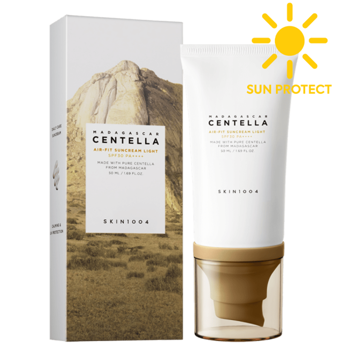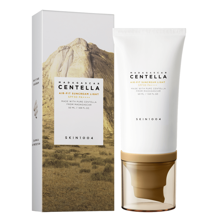 Слънцезащитният крем за лице SKIN1004 Madagascar Centella Air-fit Suncream Light блокира UV лъчите, като същевременно озарява и успокоява кожата с помощта на екстракта от азиатска центела. Подходящ за използване през цялата година, създава мек слънцезащитен слой. Не омазнява, не оставя бели следи по лицето и не се усеща тежък върху кожата. Екстрактът от азиатска центела регенерира, успокоява зачервяванията и укрепва кожната бариера, като едновременно с това възстановява нивата на хидратация. Подходяща за всеки тип кожа.