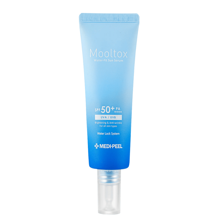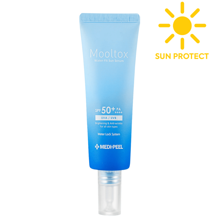 Слънцезащитен серум за лице със SPF50+PA++++, 10 вида хиалуронова киселина и серамиди Medi-Peel Aqua Mooltox Water-fit Sun Serum хидратира, омекотява, подхранва и предпазва кожата на лицето от UVA и UVB лъчите. Формулиран с обогатен комплекс от 10 вида хиалуронова киселина, който доставя на кожата интензивна хидратация и я предпазва от дехидратация. С иновативни химични слънцезащитни фактори, които осигуряват ултра висока защита от слънчевите лъчи. Съдържа ектоин, който има антиоксидантно и противовъзпалително действие, защитава кожата от замърсяване, хидратира, възстановява нарушената кожна бариера и има анти-ейдж действие.