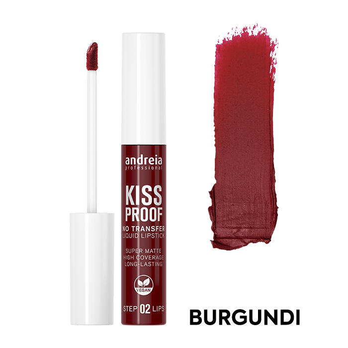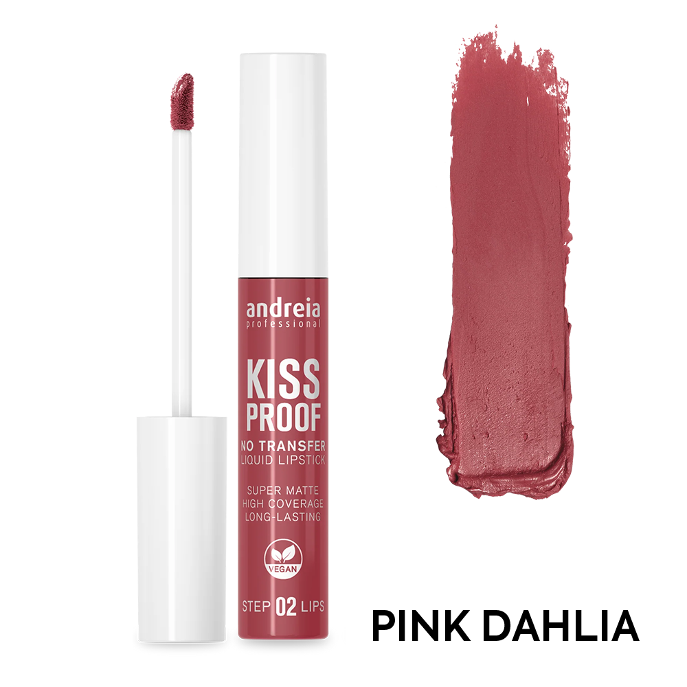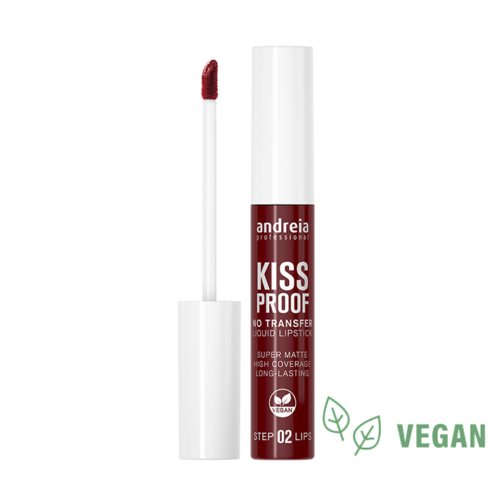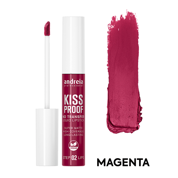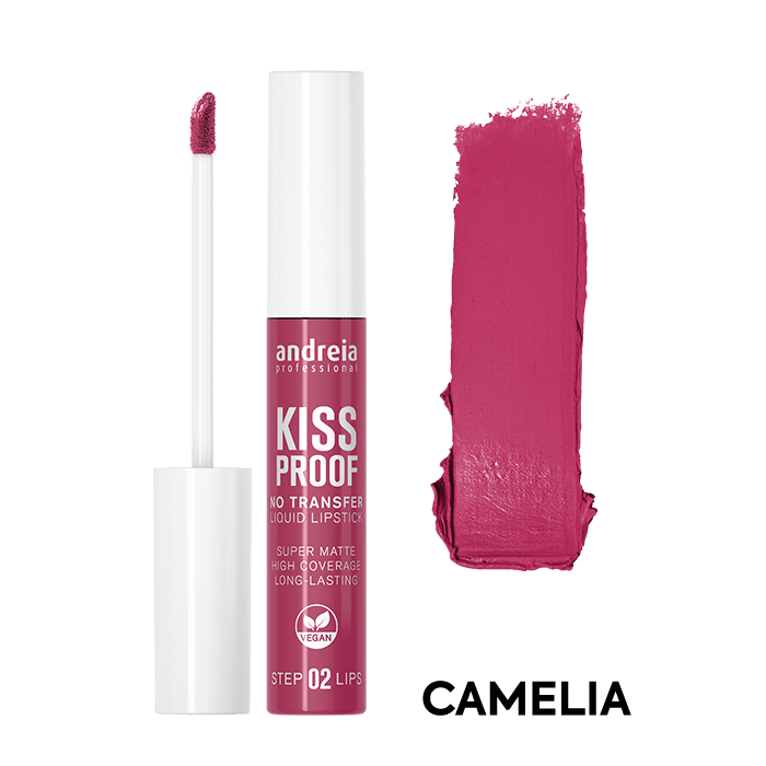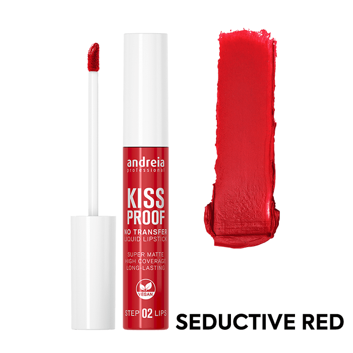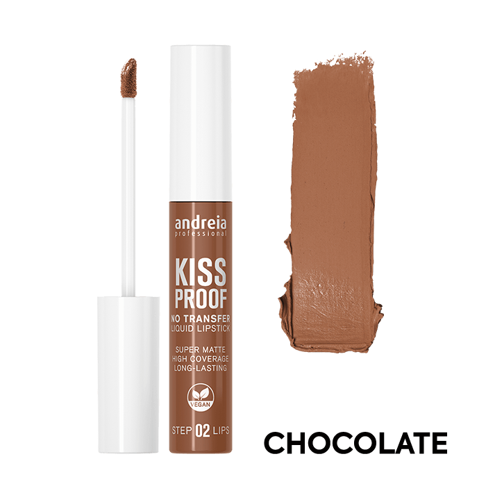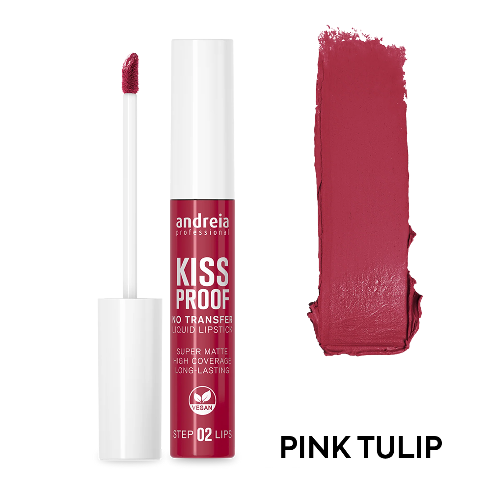 Течно матово червило Andreia Professional KISSPROOF - супер покритие с изтънчен матов ефект, за сочни устни с изразителен цвят. Запечатва се трайно върху устните, като оставя движението им свободно и комфортно - без сухота и слепване. Приляга нежно, благодарение на ергономичния апликатор, който достига до всяко ъгълче на устните и ги очертава с едно движение. Не се отпечатва при контакт и не оставя следи. Цветът остава трайно наситен и запечатан в продължение на часове.