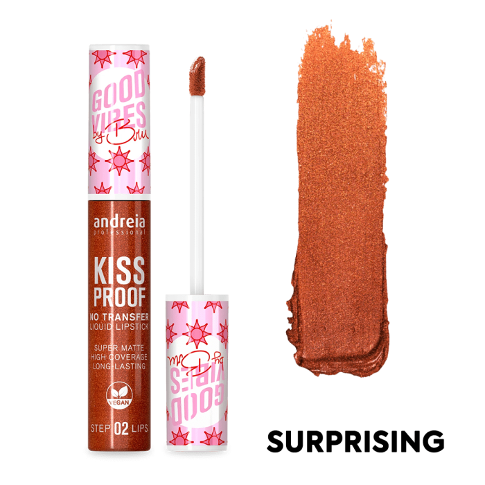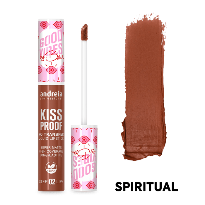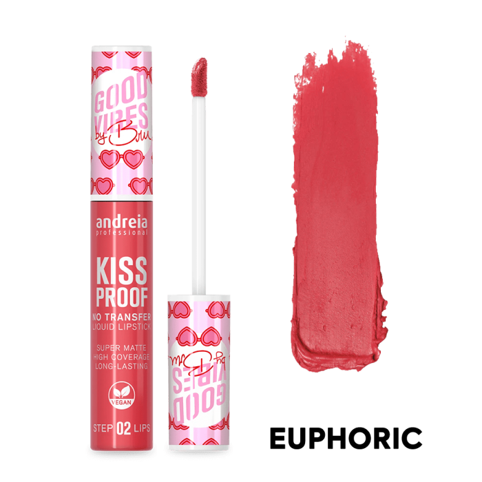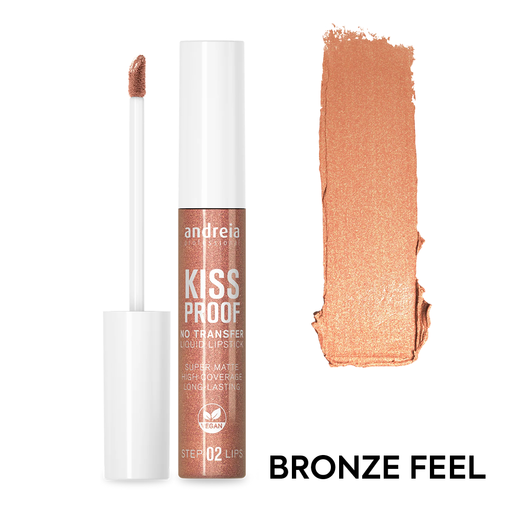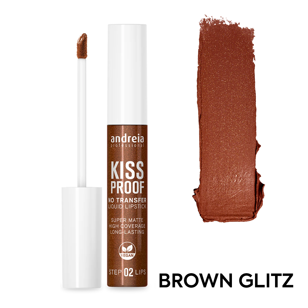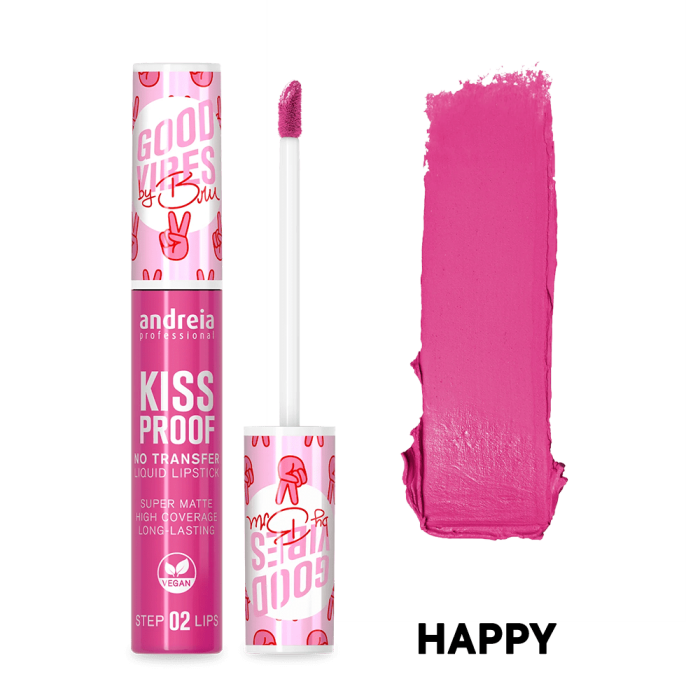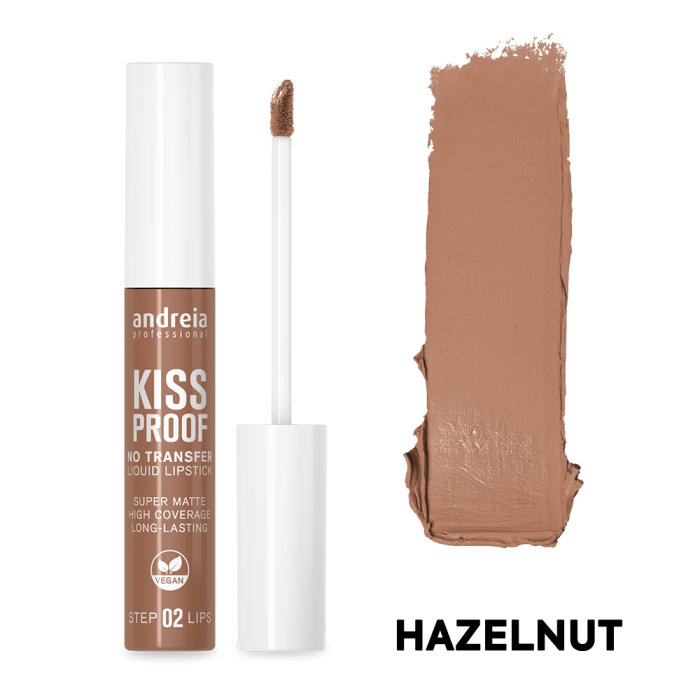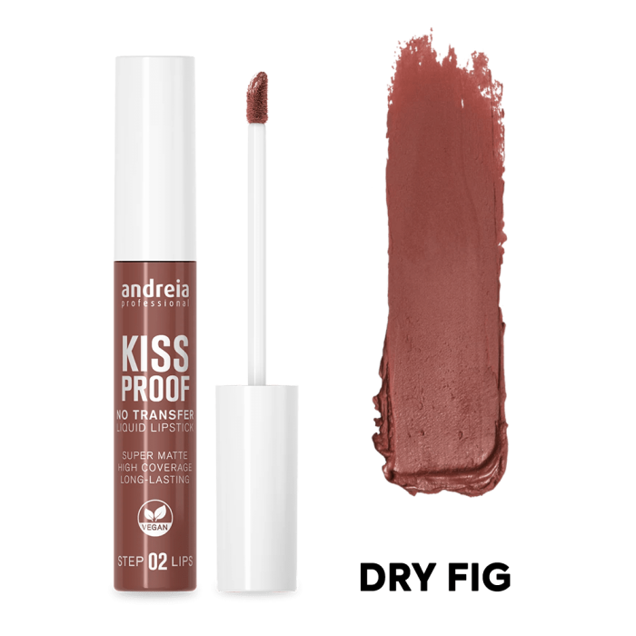 Течно матово червило Andreia Professional KISSPROOF - супер покритие с изтънчен матов ефект, за сочни устни с изразителен цвят. Запечатва се трайно върху устните, като оставя движението им свободно и комфортно - без сухота и слепване. Приляга нежно, благодарение на ергономичния апликатор, който достига до всяко ъгълче на устните и ги очертава с едно движение. Не се отпечатва при контакт и не оставя следи. Цветът остава трайно наситен и запечатан в продължение на часове.