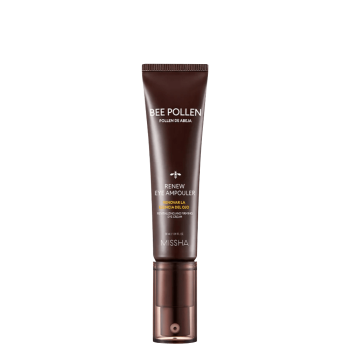 MISSHA Bee Pollen Renew Eye Ampouler е възстановяващ и озаряващ околоочен крем, който ефективно и в дълбочина хидратира и подхранва нежната зона около очите. Противодейства на признаците на стареене – фини линии и бръчки, както и на появата на тъмни кръгове. Съдържа 50% екстракт от пчелен прашец, който съживява кожата, подобрява състоянието ѝ и връща младежкия ѝ вид. Подходящ за всеки тип кожа и ежедневна употреба.