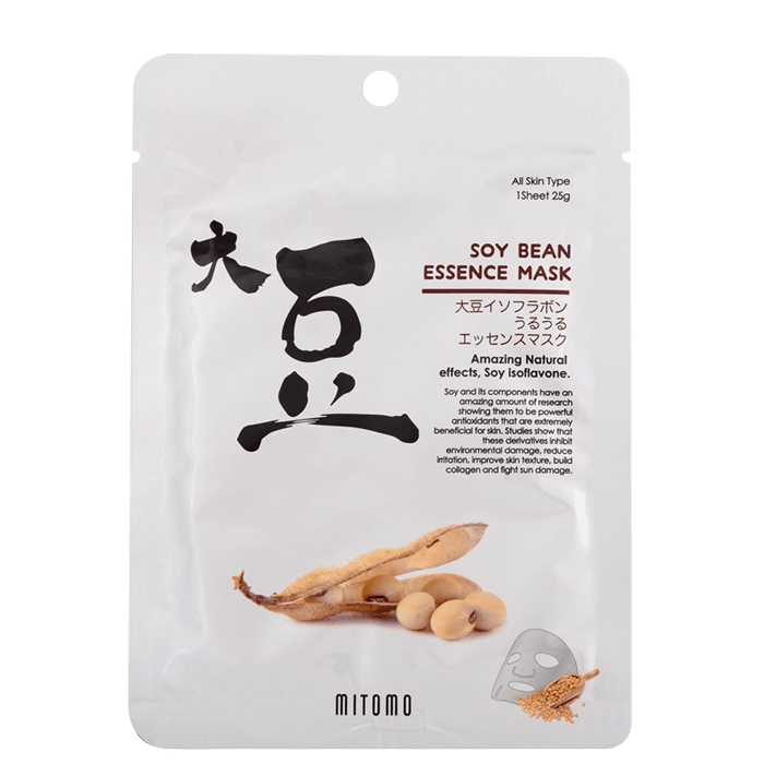 Mitomo Soy Bean Essence Mask хидратира и възстановява в дълбочина дехидратираната, суха и раздразнена кожа на лицето. Редица изследвания сочат, че соята съдържа мощни антиоксиданти, които имат изключителна полза за кожата. Намаляват вредите от околната среда и дразненето. Маската спомага за увеличаването на синтеза на колаген и подобрява текстурата. Увеличеният синтез на колаген води до изглаждането на фините линии и бръчките, намаляването на подпухналостта и поддържането на видимо чисти пори. Лецитинът, който също може да бъде открит в соята, хидратира и възстановява повърхността на кожата, благодарение на съдържанието на мастни киселини. Шийт маската е с най-високо качество и е изработена от натурални растителни фибри от бамбук.