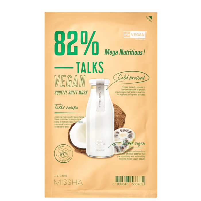 MISSHA Talks Vegan Squeeze Sheet Mask Mega Nutritious е веган шийт маска за лице с нони и кокос, която подхранва, омекотява и помага за поддържането на сияен тен на кожата. Съдържа комбинация от 82% студено пресован кокос и нони.