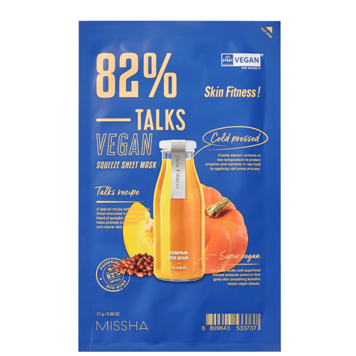 MISSHA Talks Vegan Squeeze Sheet Mask Skin Fitness е веган шийт маска за лице, която хидратира в дълбочина, изравнява тена, подобрява ексфолиращите процеси в кожата и предотвратява слънчевите увреждания. Съдържа комбинация от 82% студено пресовани тиква и червен боб.