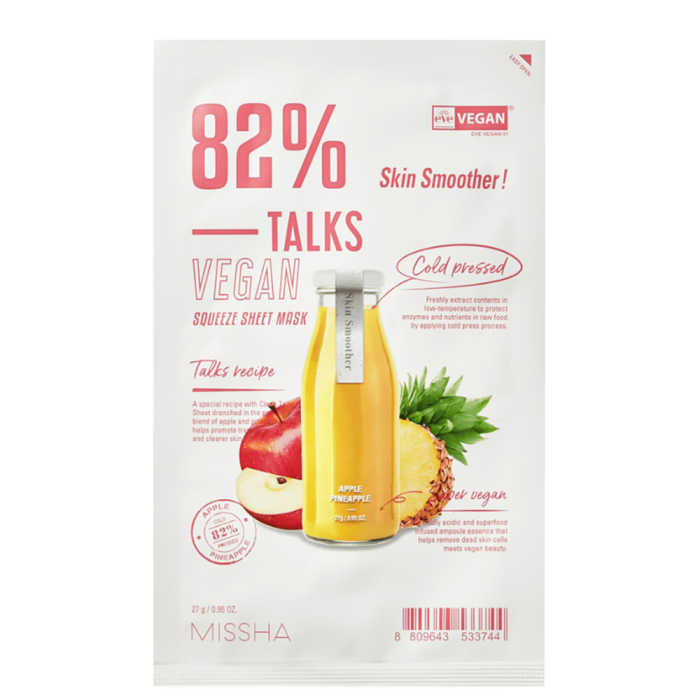 MISSHA Talks Vegan Squeeze Sheet Mask Skin Smoother е веган шийт маска за лице с ревитализиращ и нежен ексфолиращ ефект. Съдържа комбинация от 82% студено пресовани ябълка и ананас. Киселинността на ябълката и ананаса ексфолира кожата и премахва мъртвите кожни клетки, като оставя кожата мека и гладка. В резултат, текстурата на кожата е по-равномерна, а тенът е по-сияен и изравнен.