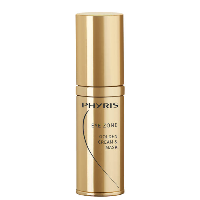 PHYRIS Eye Zone Golden Cream & Mask е богат продукт за околоочна грижа с двойно приложение. Може да се използва като дневен околоочен крем или като интензивна маска през нощта. Деликатната кремообразна текстура, обогатена със златни микрочастици и екстракт от червени водорасли (алгае), осигурява невероятно хидратиращо и стягащо въздействие върху деликатната околоочна зона. Съдържа хиалуронова киселина с удължено освобождаване, която се свързва с влагата, увеличава нейния обем и я поддържа в продължение на часове. Екстрактът от лавандула, познат като „растителен ботокс“ изглажда и релаксира кожата, подложена на агресивните условия на околната среда. При ежедневна употреба, околоочният контур се усеща копринено мек, хидратиран и еластичен.