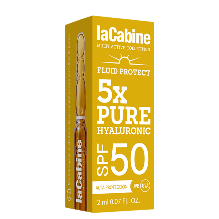 Ампула Fluid Protect 5x Pure Hyaluronic SPF50 перфектно съчетава 5-те вида НА, което позволява по-голяма ефективност и дълготраен ефект, като действа във всеки един от слоевете на епидермиса – от вътрешния до външния. Интензивно хидратира и реструктурира епидермиса, придавайки плътност и еластичност. Възстановява загубената влага и помага за намаляване на появата на фини линии и бръчки. Стимулира обновяването на клетките и намалява увреждането на кожата от външната среда. Кожата изглежда и се чувства по-мека, по-хидратирана, по-плътна и млада.