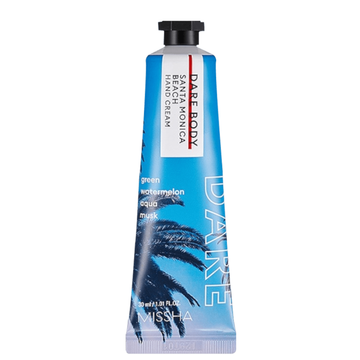 MISSHA Dare Body Hand Cream Santa Monica Beach е хидратиращ и подхранващ крем за ръце с нежен летен аромат. Кожата на ръцете е подложена на постоянното влияние на факторите на околната среда като студ, слънчеви лъчи, вятър. Кремът за ръце на MISSHA предпазва кожата от дехидратация, като едновременно с това бързо се абсорбира и не оставя лепкав слой. Екзотичният аромат на диня и кехлибар ще ви пренесе мислено на топъл плаж, с коктейл в ръка.