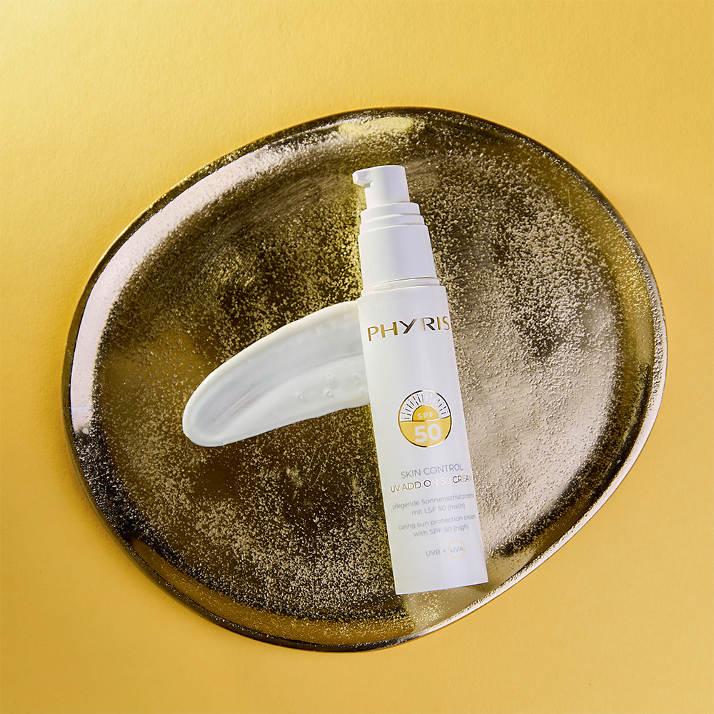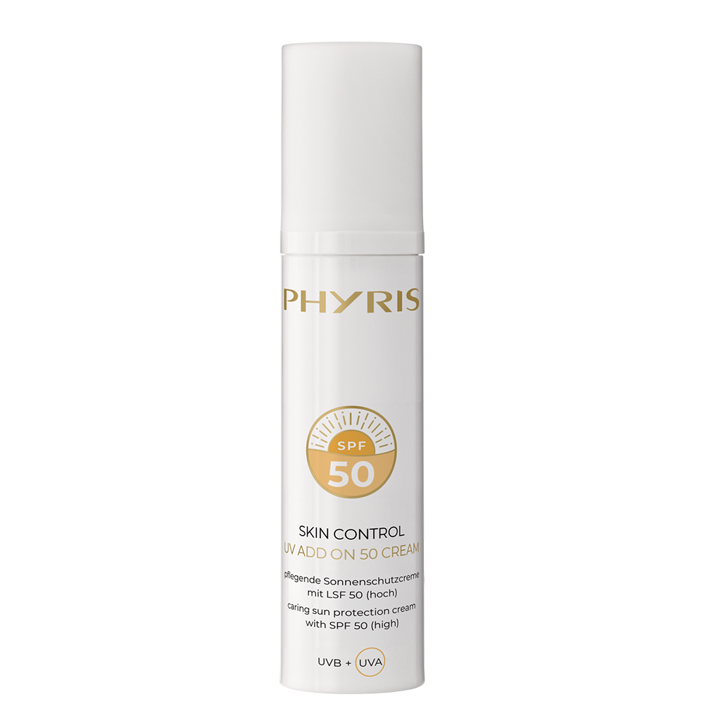 PHYRIS Skin Control UV ADD ON 50 Cream е крем за лице със слънцезащитен фактор SPF50. Осигурява перфектна защита и балансира всеки тип кожа. Предпазва от вредните UV лъчи, които водят до допълнително раздразнение, сухота и преждевременно стареене. Подобрява цялостното функционално състояние на тъканите, успокоява раздразненията и осигурява пълноценна дневна защита от агресорите на околната среда. Има лека кремообразна формула, която не оставя бели следи и не утежнява.