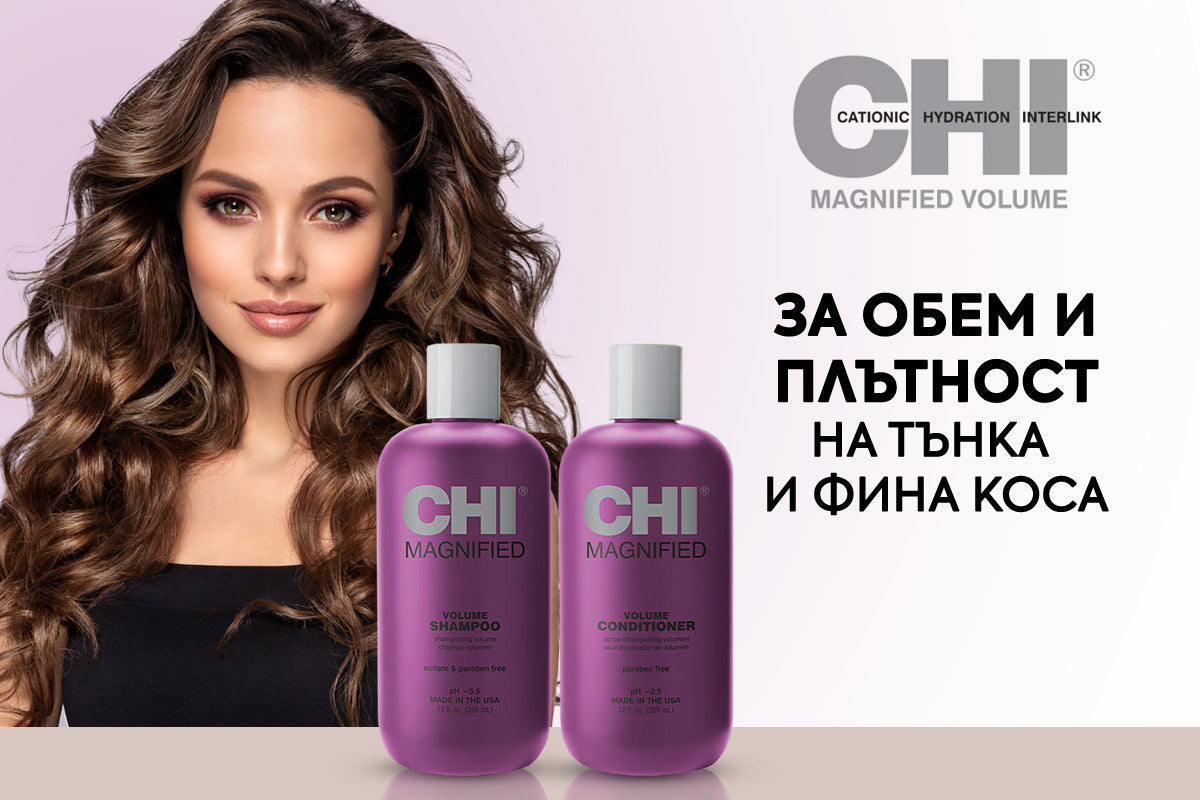 Magnified Volume За обем от CHI е линия специално създадена за да даде обем, плътност, здравина и сила на тънките и слаби коси с дълготраен ефект на прическата. Богат комплекс от керамика и активни съставки от протеини проникват във всеки отделен косъм като го укрепват и подсилват от вътре навън придавайки му невероятен блясък.