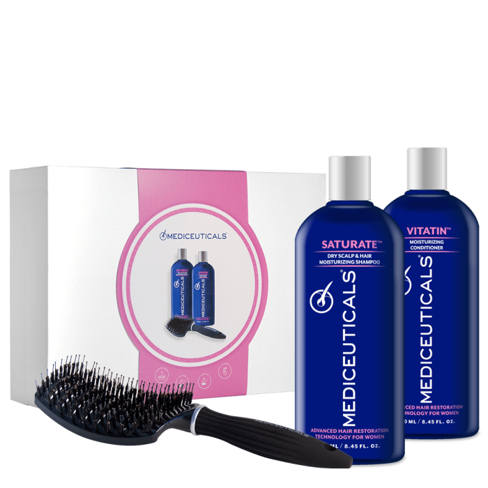 Комплектът против косопад и за стимулиране на растежа за жени със сухи скалп и коса с четка Mediceuticals Advanced Hair Restoration Kit съдържа: