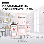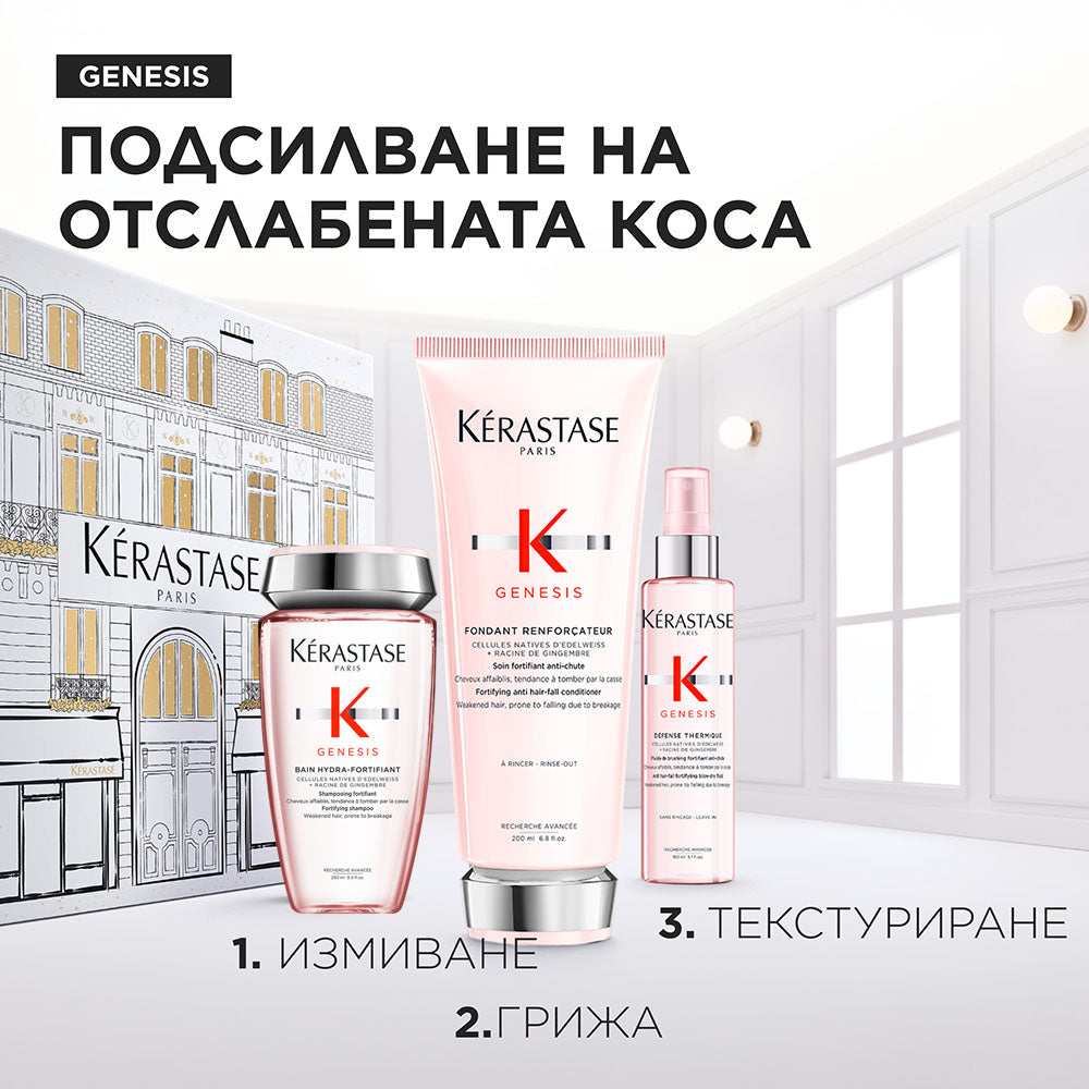 Серията Genesis на Kérastase предлага иновативна грижа против косопад без компромис по отношение на чувственото изживяване. Тя комбинира мощни съставки – клетки от еделвайс, корен от джинджифил и аминексил в луксозна формула, която действа против косопад, причинен от накъсване по дължините. Продуктите Genesis предпазват косата, интензивно подхранват и предотвратяват косопада.