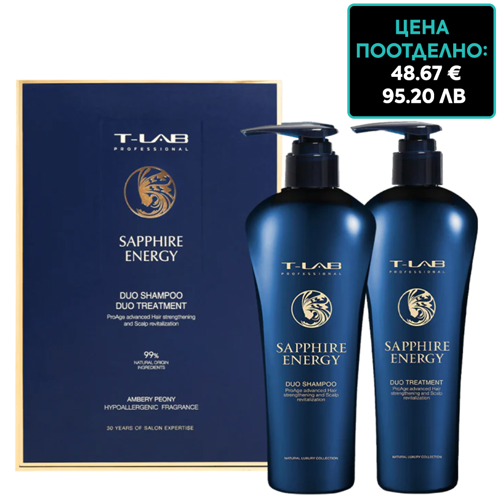 Ревитализиращ шампоан анти-ейдж T-LAB Sapphire Energy Duo Shampoo е ProAge терапевтичен шампоан, насочен към поддържането и подобряването на цялостното състояние на косата с напредването на възрастта. Отговаря на всички специфични нужди на зрялата коса, които се появяват с възрастта, като загуба на обем и плътност, побеляване, намалена еластичност и сухота. Комбинация от растителни екстракти и сертифицирани органични съставки възвръщат виталността и огледалния блясък. Идеалното решение за всички типове коса, особено за зряла, изтощена и слаба коса, която се нуждае от специална ProAge грижа.
