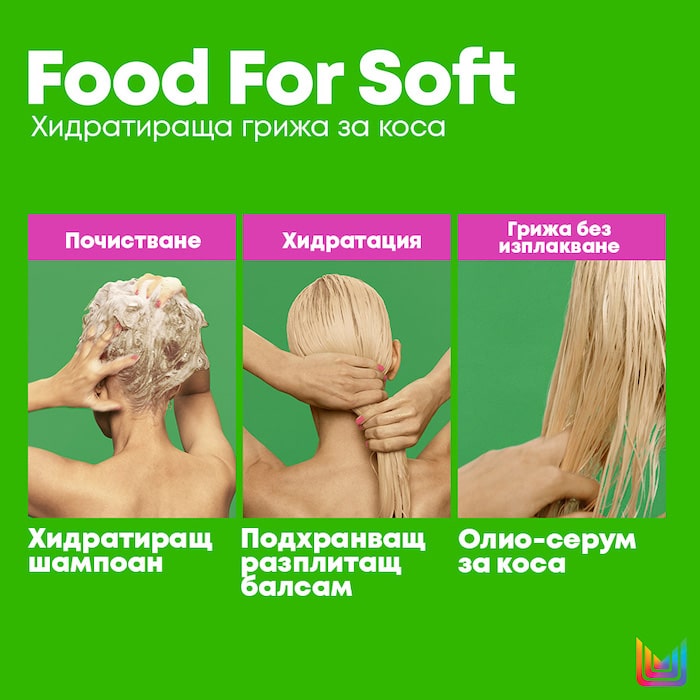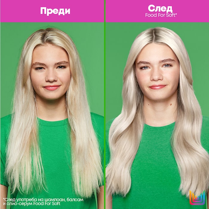 - Придава блясък. *Инструментален тест след употреба на шампоан, балсам и олио-серум Food For Soft.