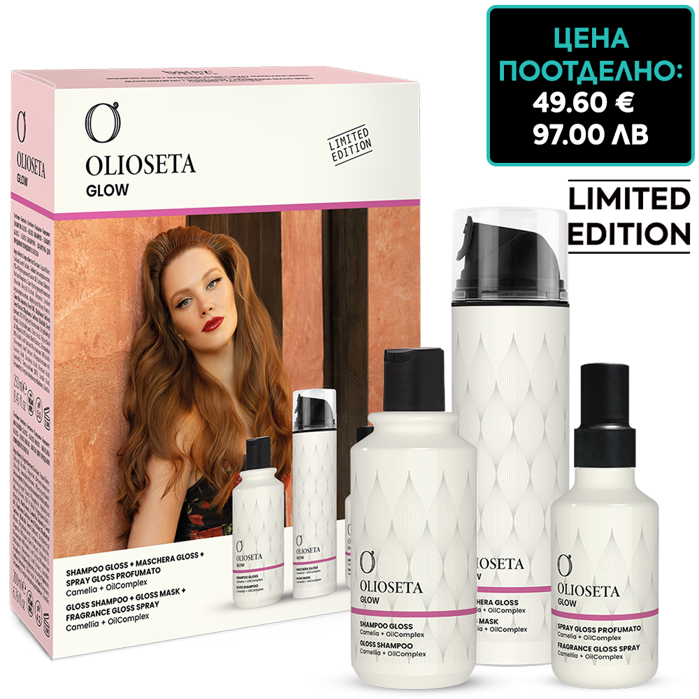 Комплект GLOW придава на косата гланциращ блясък. НЕЗАБАВНО. Заглажда стърчащите краища, за да отрази триизмерно светлината. Прави косата копринена на допир. Опакован в луксозна, твърда кутия, комплект GLOW е готово решение за подарък, което ще се хареса и на най-взискателните. Формулирани с масло от Камелия и иновативен OilComplex (комбинация от 3 масла от: розмарин, магнолия и репичка), продуктите от серия GLOW превръщат косата в блестящ воал. Затварят кутикулата на косъма, като по този начин изглаждат текстурата на косата и не позволяват на цвета да избледнее.
