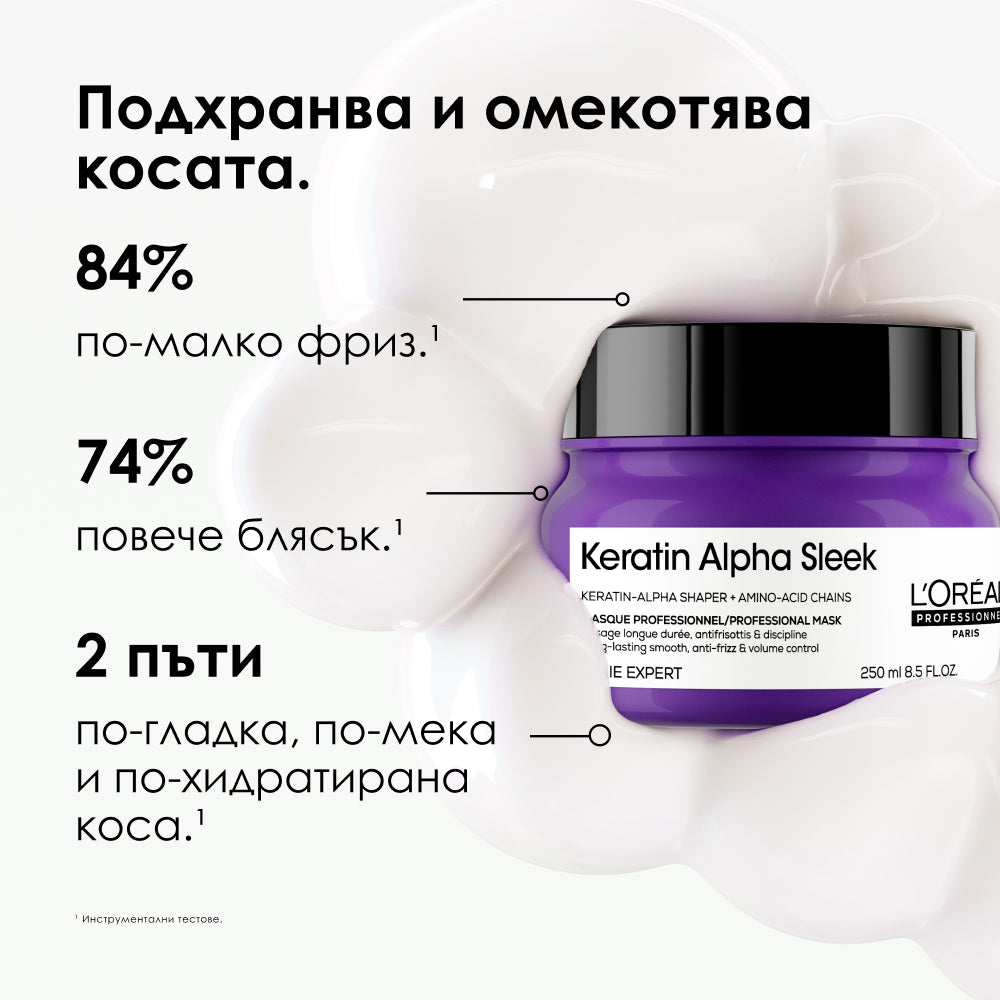 Маската Keratin Alpha Sleek е идеалното решение за всеки, който търси дълготрайна гладкост. Формулата действа в дълбочина, като запълва микро-уврежданията в структурата на косъма и изгражда защитен слой срещу влагата. Благодарение на подхранващите съставки и маслото от ший, тя трансформира сухата и непокорна коса в лека и еластична.