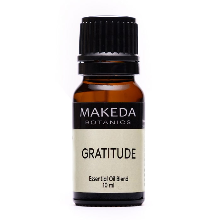 Композицията MAKEDA Botanics Gratitude съдържа бленд от шест етерични масла с повдигащ аромат, който насърчава благодарността и удовлетворението. Редуцира безпокойството, повишава концентрацията и успокоява ума, отваряйки съзнанието за всичко хубаво, което предстои. Тази композиция от етерични масла е мощен стимулатор с тонизиращ и ободряващ духа ефект, който зарежда с чувство на признателност, щастие и душевен баланс.