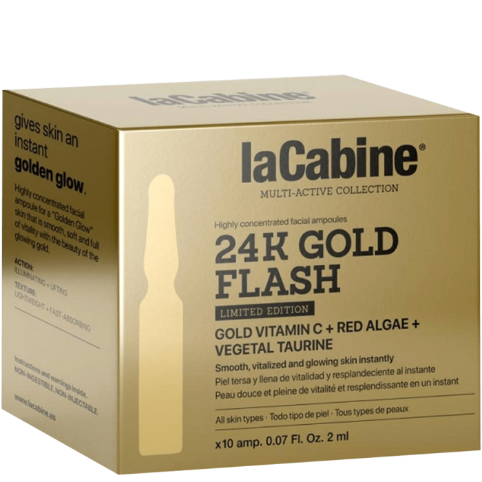 Ампули 24K Gold Flash Effect са перфектни при специални поводи, събития, партита или ежедневно, когато е необходимо бързо действие против стареене, бръчки и умора. Моментално връщат свежия и жизнен вид, като осигуряват ефект на “Златен блясък“. Правят кожата на лицето по-стегната и премахват всяка следа от умора. Изглаждат несъвършенствата, озаряват и подмладяват.