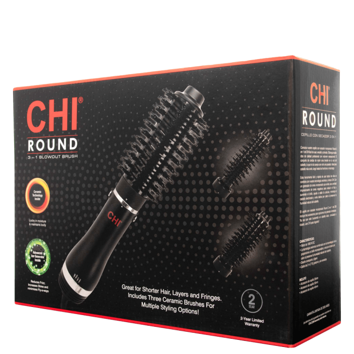 CHI ROUND 3-in-1 BLOWOUT BRUSH е разработена с керамична и йонна технология. Включва вграден йонен генератор, който освобождава изключително голямо количество отрицателни йони. Те помагат за запечатване на кутикула и задържане на влагата в косъма, като по този начин предпазват от топлинно увреждане. Технологията спомага за елиминиране на фриз ефекта, придава гладкост и осигурява повече блясък.