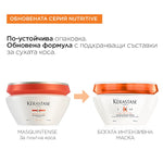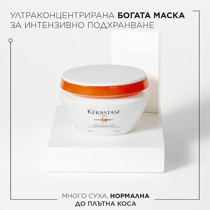 Интензивна маска за много суха, нормална до плътна коса Kerastase Nutritive Masquintense Riche има богата кремообразна текстура, което я прави подходяща за плътна коса. Обогатена с протеини с растителен произход, ниацинамид и подхранващи липиди. Има укрепващо действие, подхранва, придава еластичност, блясък и сатенена мекота на косата.