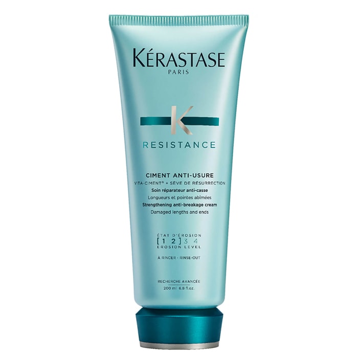 Kérastase Ciment Anti-Usure е балсам за слаби, изтощени дължини и връхчета. Изглажда от корена до върха, правейки косъма твърд, еластичен и жилав. Помага за предотвратяване на накъсване и цъфтеж на косата с патентована молекула Intra-Cylane. Възстановява косъма от вътре навън, като подпомага лесното разресване.