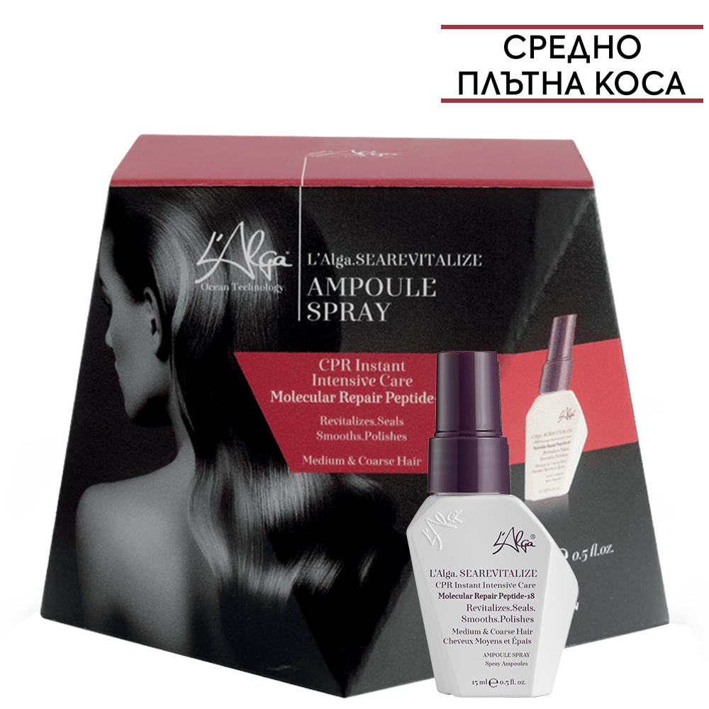 Спрей ампула SEAREVITALIZE незабавно стартира и ускорява оздравителния процес на косата. Само няколко впръсквания са напълно достатъчни, за да усетите косата си интензивно възстановена на молекулярно ниво. Попълва увредените участъци на косъма, като възвръща силата и еластичността. Изглажда стърчащите краища и има полиращ ефект, който разкрива абсолютния блясък на косата. Усъвършенстваната формула от последно поколение с пептид 18 и революционния комплекс AlgaNord 5 ™, в комбинация с хиалуронова киселина, сусамов протеин и специални подхранващи агенти, осигурява незабавно интензивно възстановяване на косата до най-дълбоките слоеве на косъма. Активира наново изграждането на вече счупените кератинови връзки, като по този начин драстично подобрява здравината, блясъка и мекотата на косата. Защитава цвета на боядисаната коса от избледняване. Резултатът е огледален блясък, естествено движение и копринена текстура.