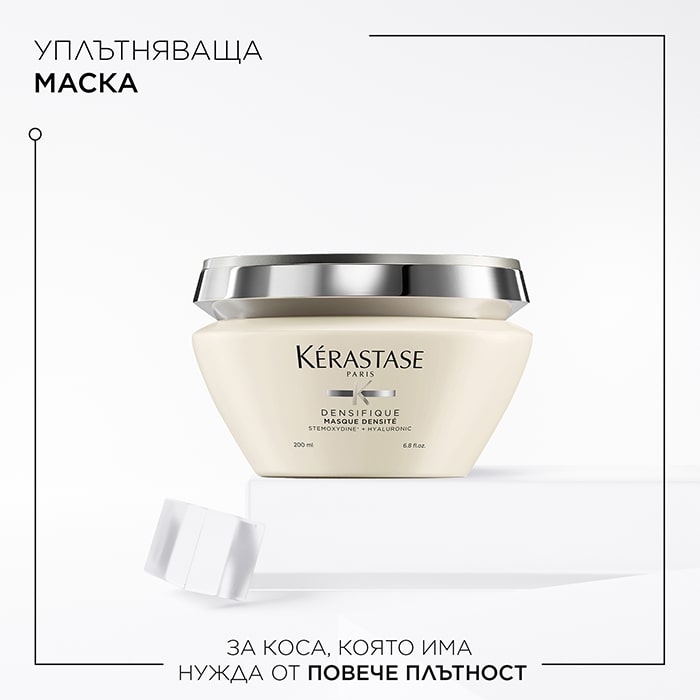 Интензивна регенерираща маска за сгъстяване и уплътняване на косата Kérastase Densifique Masque Densite. Трансформира косата, като добавя текстура и регенерира от корена до върха, създавайки оптимална среда за здрава и силна коса. Подхранва и придава плътност на фини, тънки или изтънели коси. Укрепва косъма и улеснява оформянето. Косата е по-плътна, обемна, гладка и лека. Маската регенерира и ревитализирана косата, като й добавя неустоим блясък.