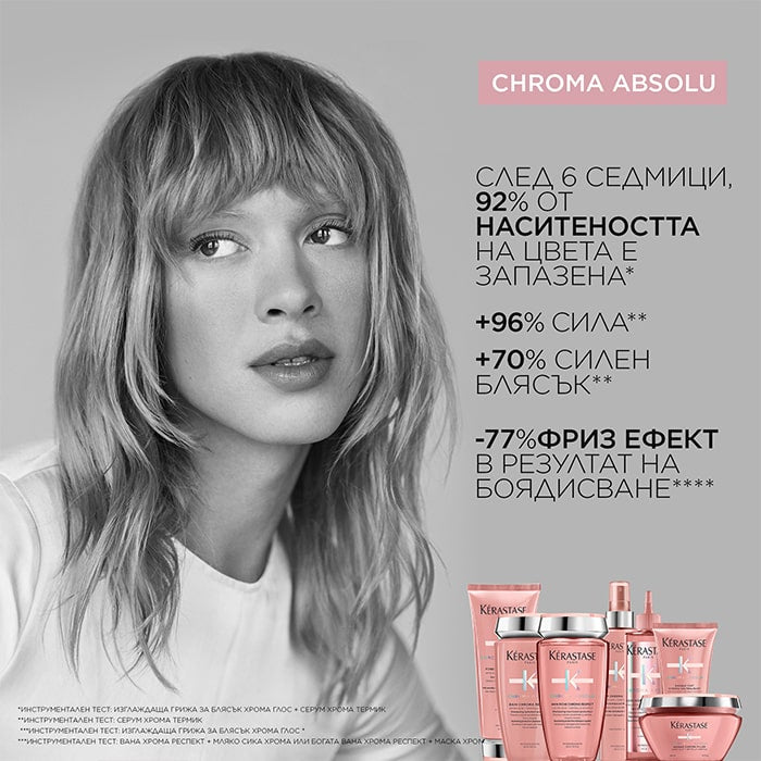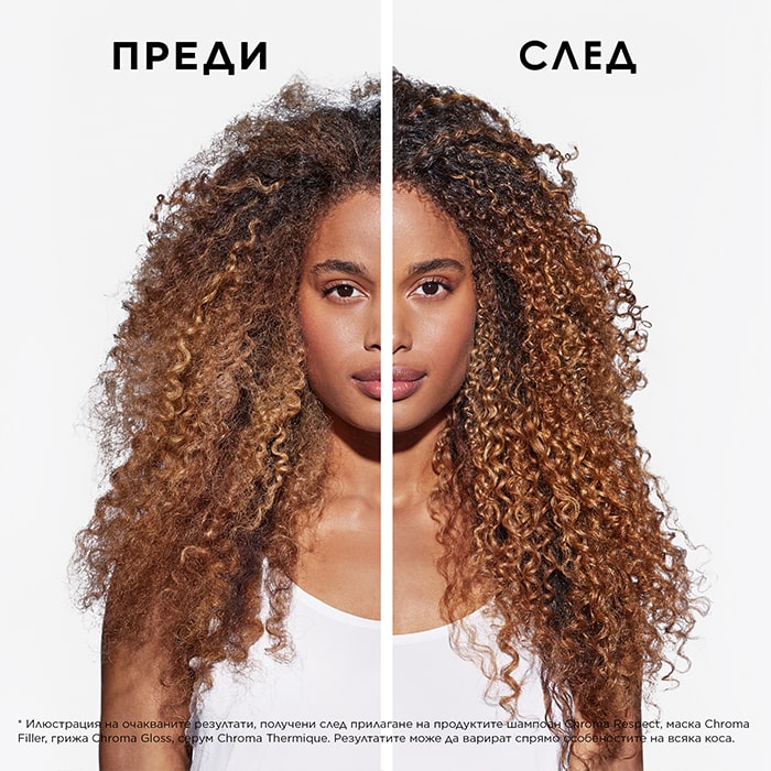 *Инструментален тест: шампоан за плътна коса Chroma Respect + изглаждащ флуид за блясък Chroma Gloss + маска Chroma Filler.