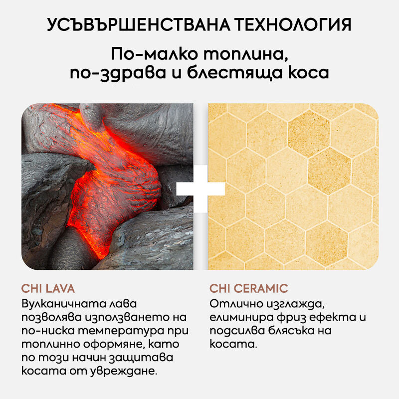 Патентованата CHI Volcanic Lava Ceramic технология елиминира статичното електричество, като по този начин осигурява перфектно изглаждане, намалява фриз ефекта и предпазва от увреждане.