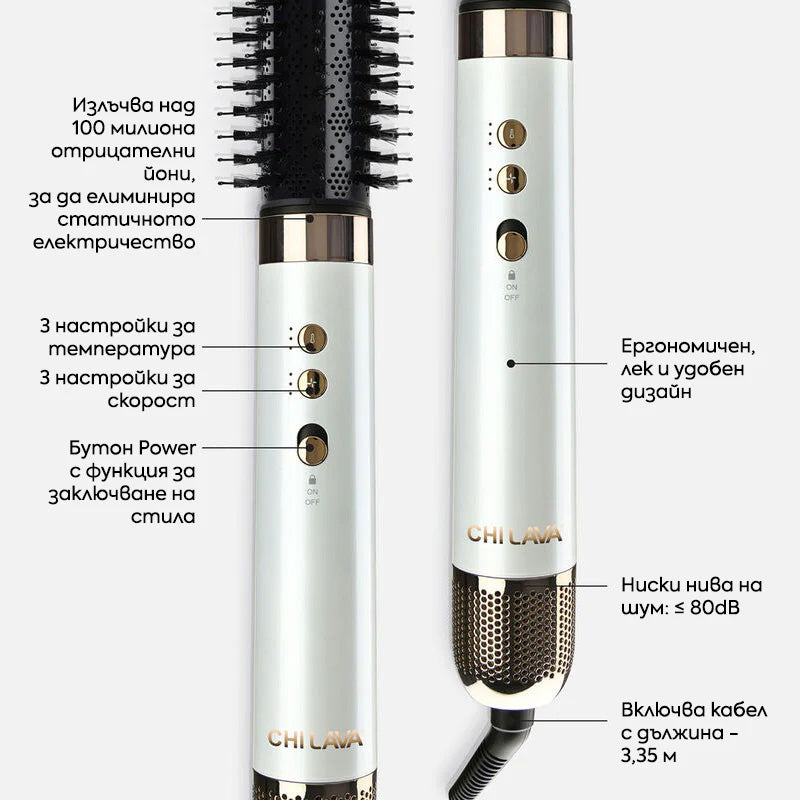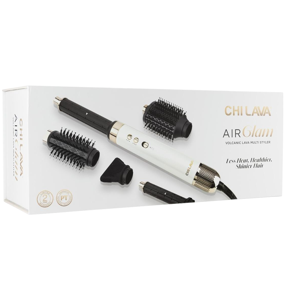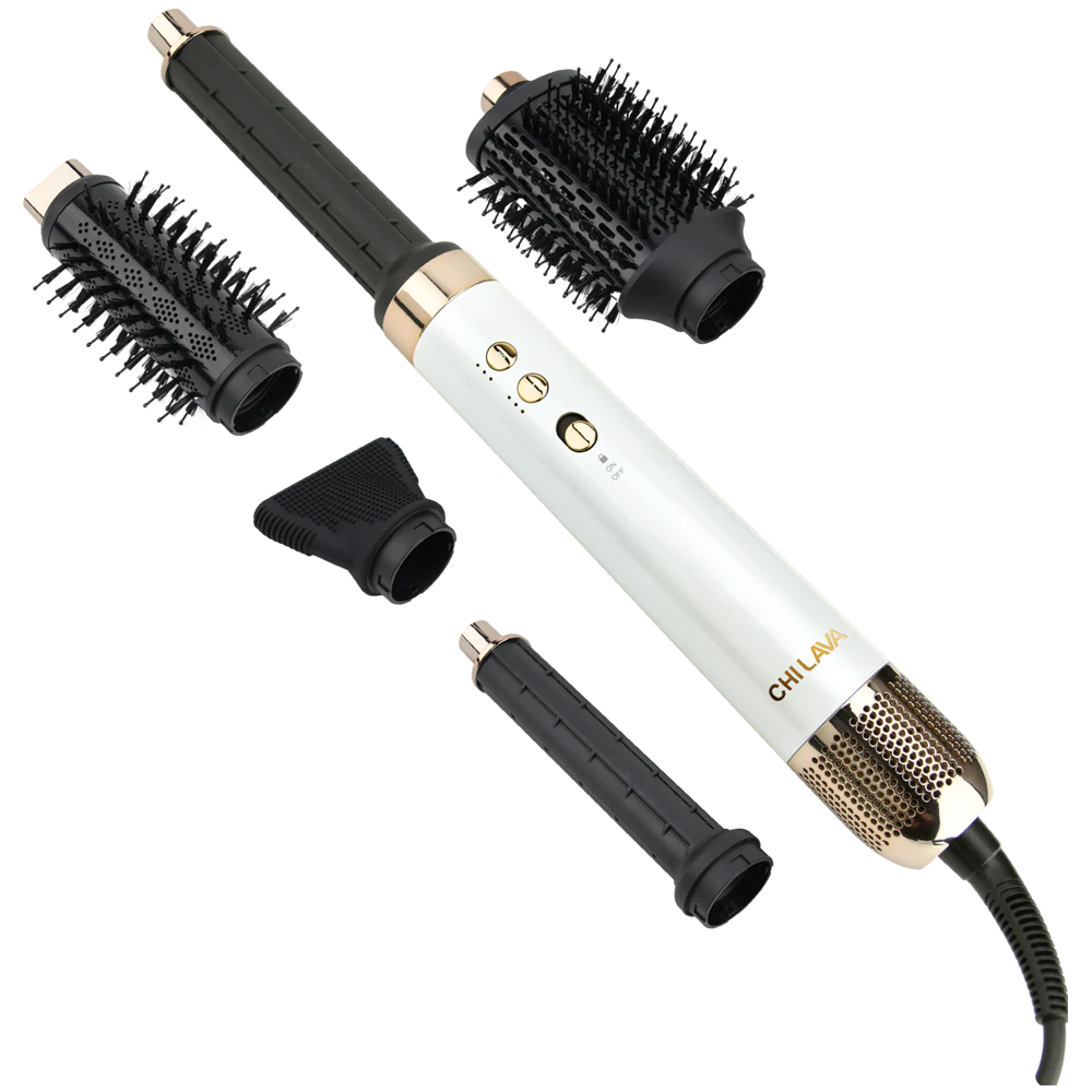 CHI Lava AirGlam Multi-Styler включва 5 приставки за оформяне, които се сменят бързо и лесно. Разработен е с три настройки за температура и три настройки за скорост на въздушния поток, както и функция за заключване на стила, която е лесно достъпна с бутон ON/OFF.