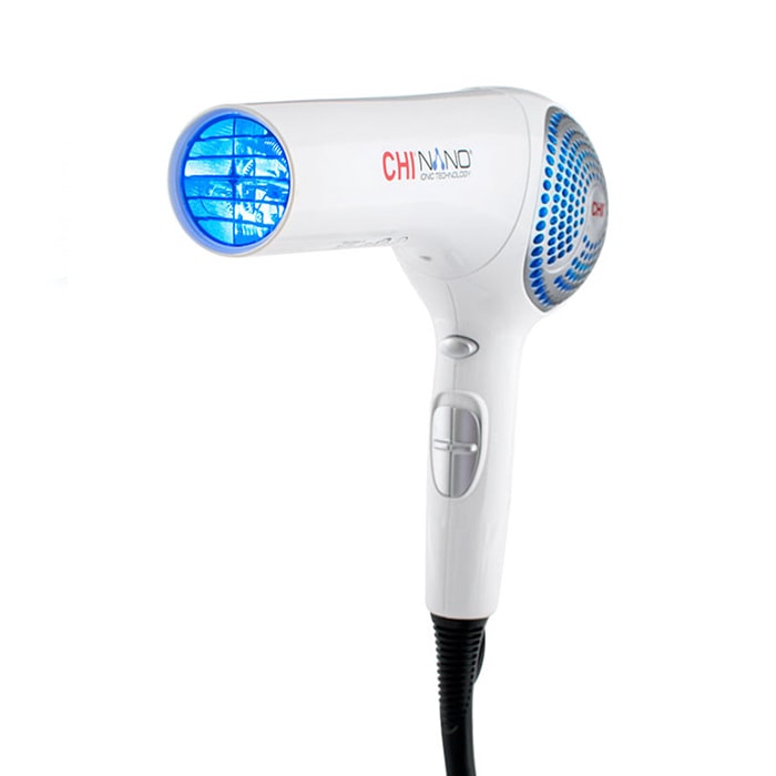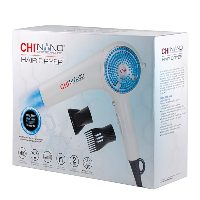 CHI Nano Silver & Blue Light работи чрез излъчване на вълни, които елиминират 99% от бактериите и микроорганизмите. Попадайки във вентилационните отвори на сешоара бактериите и микроорганизмите биват неутрализирани на ДНК ниво от нано сребърните частици и синята светлина. Резултатът е чиста въздушна струя, която гарантира по-здравословно изсушаване. Технологията предпазва вътрешната част на сешоара от натрупване на бактерии и замърсители.