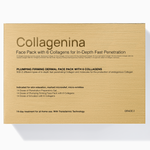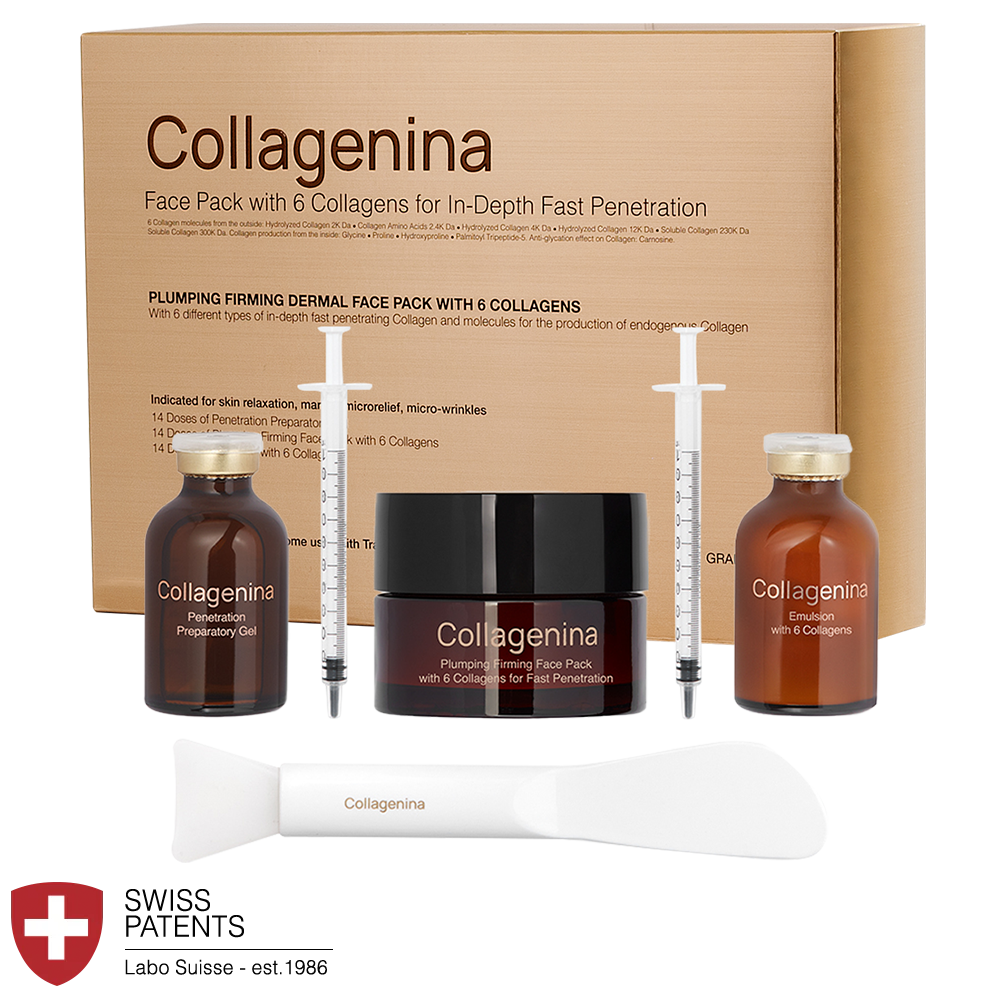 Стягаща и уплътняваща терапия с 6 вида колаген Collagenina Face Pack With 6 Collagens Intensive Treatment e дермо-козметична терапия за лице и шия, за употреба в домашни условия за външно приложение. От 20-годишна възраст градивните елементи на кожата, по-специално колагеновите влакна, започват да се разграждат, причинявайки отпуснатост на кожата, свличане и фини линии. Генетиката, излагането на слънце и нездравословният начин на живот могат да ускорят стареенето на кожата.
