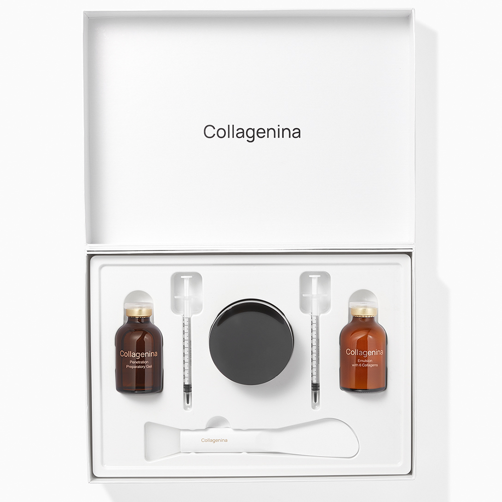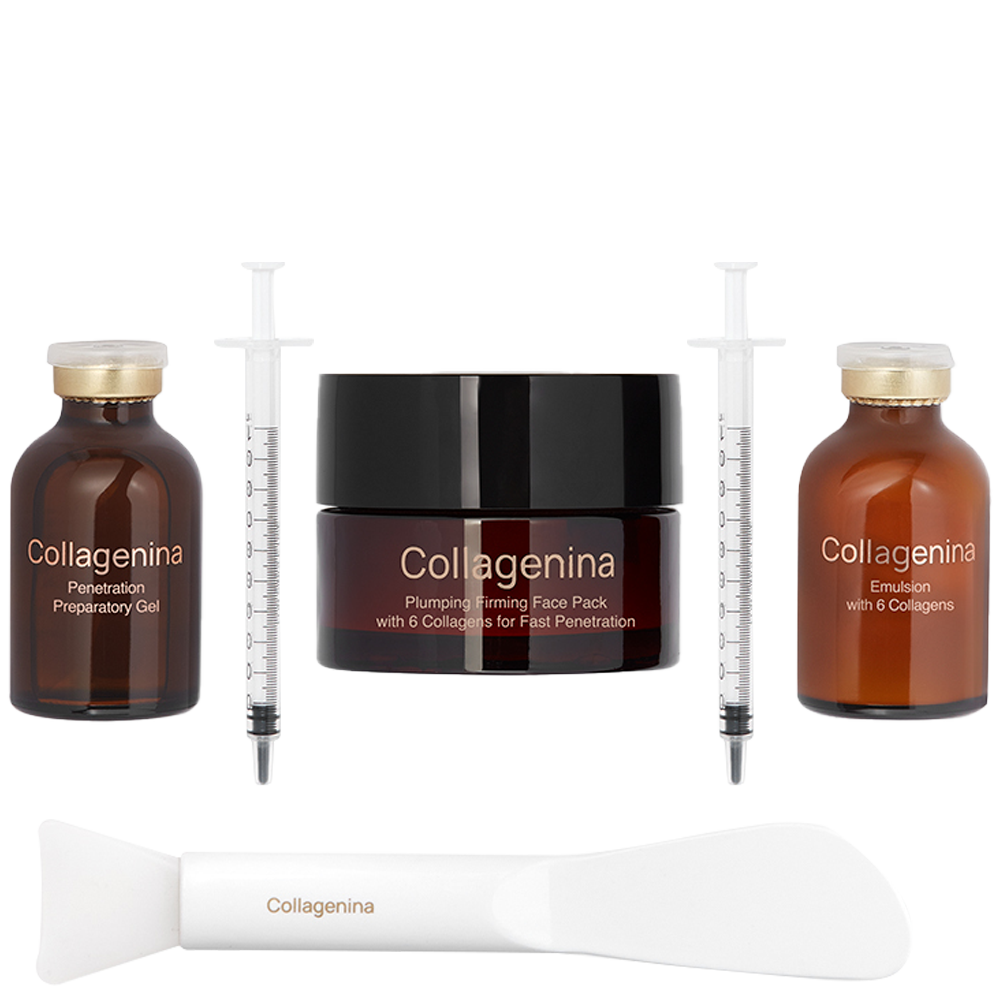 Стягаща и уплътняваща терапия с 6 вида колаген Collagenina Face Pack With 6 Collagens Intensive Treatment e дермо-козметична терапия за лице и шия, за употреба в домашни условия за външно приложение. От 20-годишна възраст градивните елементи на кожата, по-специално колагеновите влакна, започват да се разграждат, причинявайки отпуснатост на кожата, свличане и фини линии. Генетиката, излагането на слънце и нездравословният начин на живот могат да ускорят стареенето на кожата.