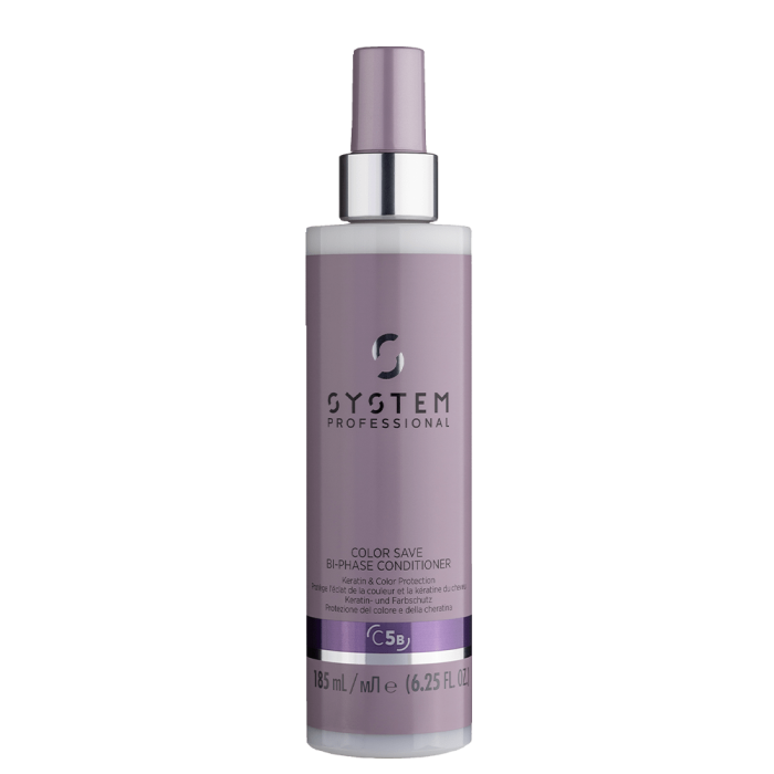 System Professional Color Save Bi-Phase Conditioner активно защитава всички видове боядисана коса. Ефективно предотвратява избледняването и промяната на цвета. Защитава протеина в косъма, като спомага за капсулирането на свободните радикали. Изгражда покривен слой върху косъма и така улеснява разресването и оформянето.