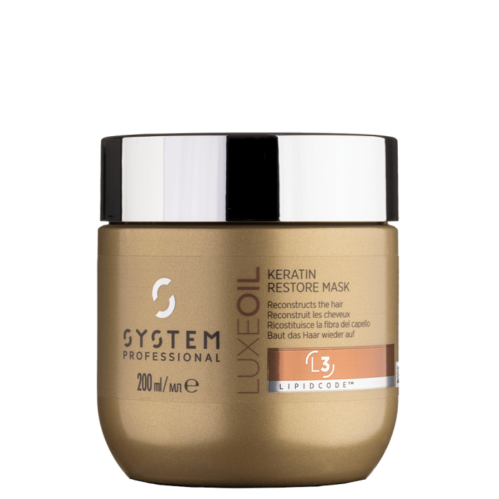 System Professional LuxeOil Keratin Restore Mask моментално реконструира косата, подобрявайки текстурата ѝ, като я оставя копринено мека на допир. Маската предоставя подхранваща и регенерираща грижа за разкрасяване от корена до върха. С LipidCode™ комплекс.