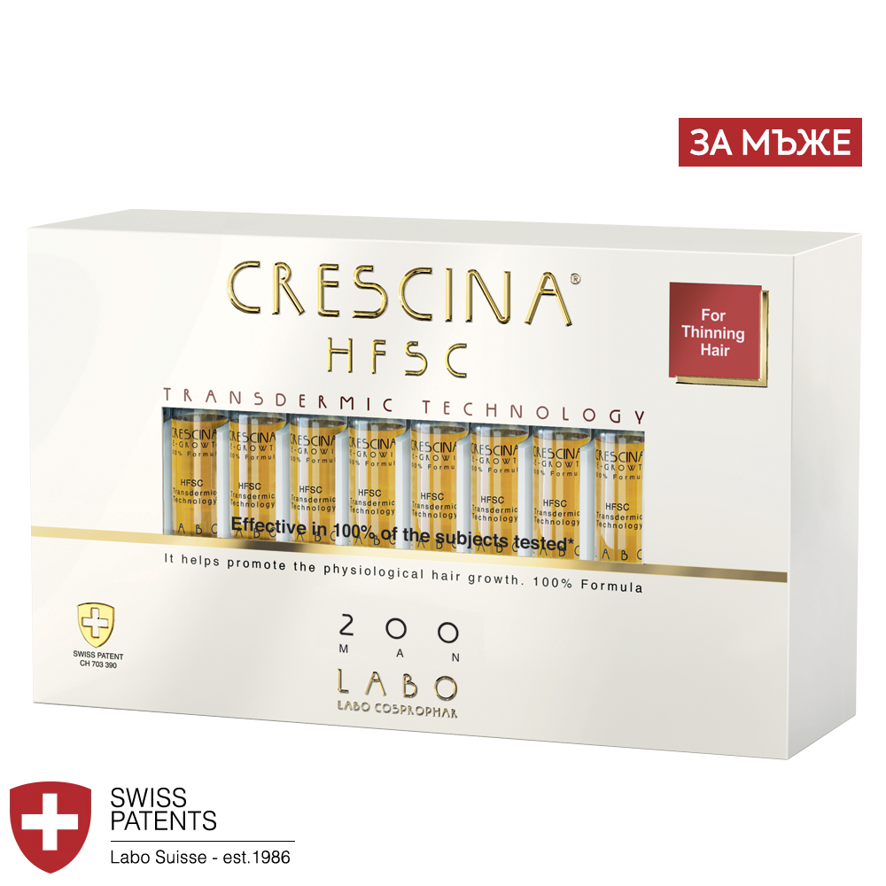Crescina Transdermic Re-Growth HFSC 200 Man е локален дермо-козметичен продукт, който възстановява и стимулира физиологичния растеж на косата в начален стадий на оредяване при мъже. Формулата съдържа: Re-Growth комплекс (Cysteine, Lysine, Glycoprotein), HFSC комплекс (Stem-Engine), нов re-growth бустер комплекс (Methionine, Glycine, Copper Tripeptide-1) и 3 подобрителя (Pentylene Glycol, Decylene Glycol, Caprylyl Glycol). Crescina Transdermic Re-Growth HFSC се препоръчва в случаи на оредяване, при което причините са физиологични, а не патологични. Не действа върху напълно атрофирали космени фоликули. Специална формула за мъже.