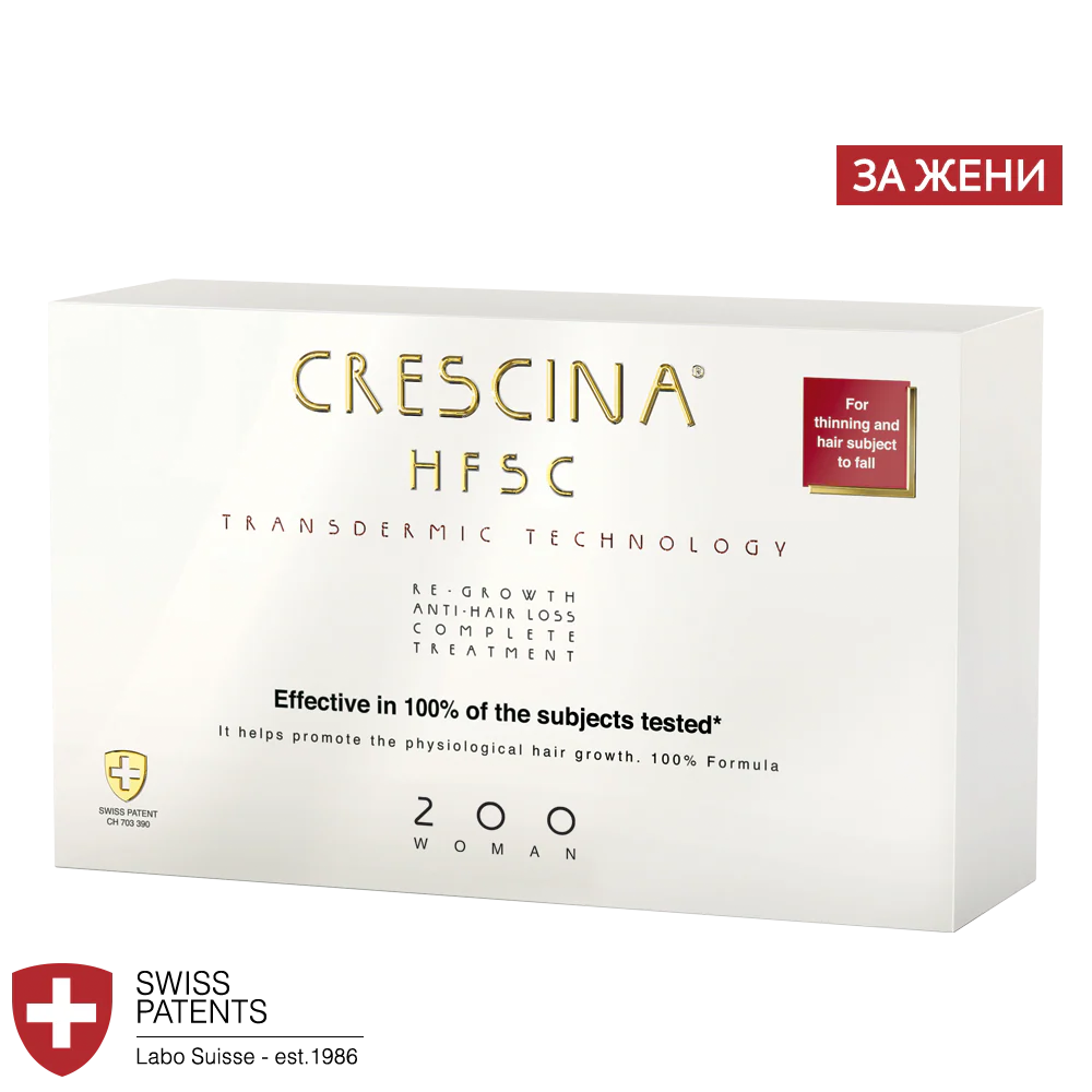 Цялостната терапия за възстановяване растежа на косата и против косопад за жени Crescina Transdermic HFSC Complete Treatment 200 Woman е предназначена за употреба при начален стадий на оредяване на косата и наличие на косопад.