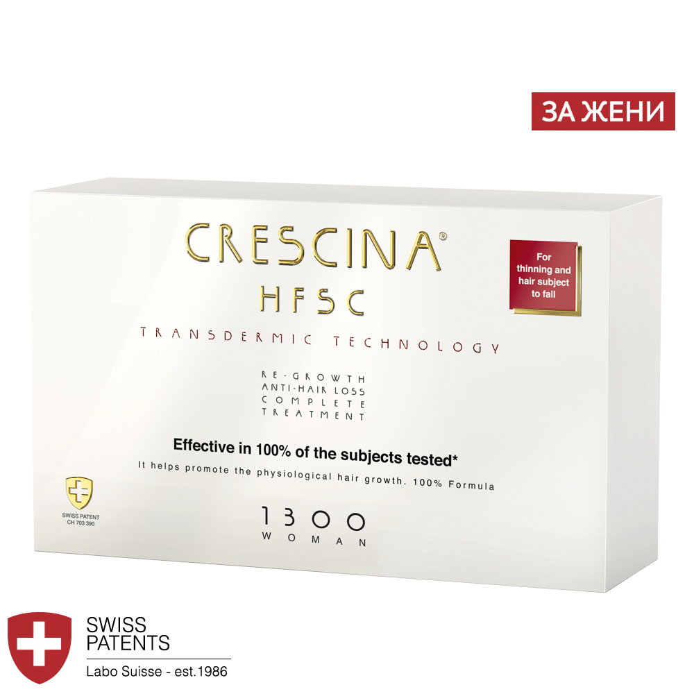 Цялостната терапия за възстановяване растежа на косата и против косопад за жени Crescina Transdermic HFSC Complete Treatment 1300 Woman е предназначена за употреба при напреднал стадий на оредяване на косата и наличие на косопад.