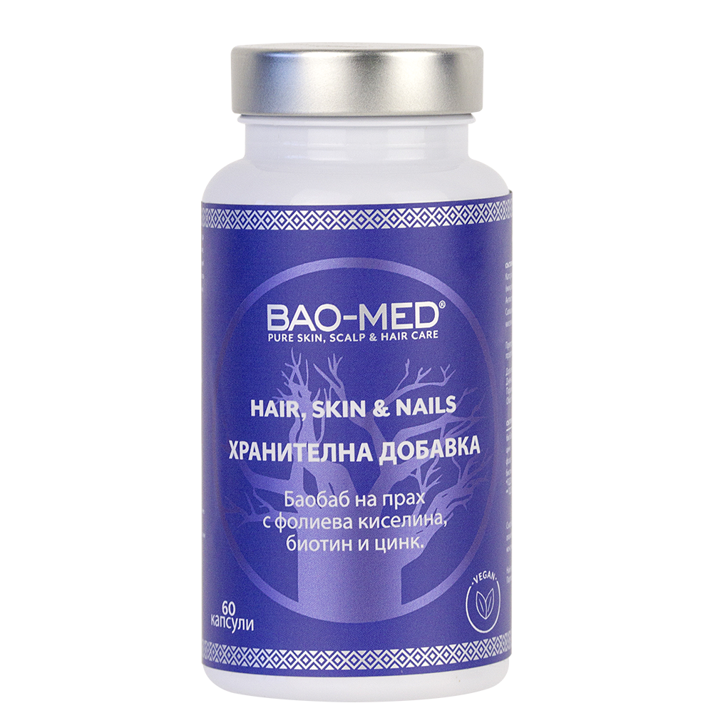 Хранителните добавки BAO-MED подобряват състоянието на косата, кожата и ноктите. Формулата е на основата на екстракт от баобаб от Южна Африка, биотин, цинк и фолиева киселина, които осигуряват оптимално здравословно състояние на косата, кожата и ноктите.