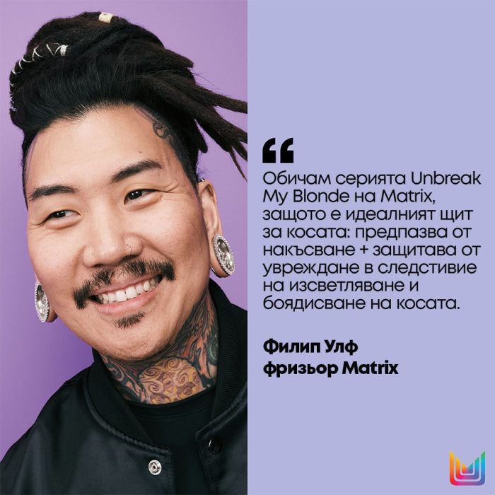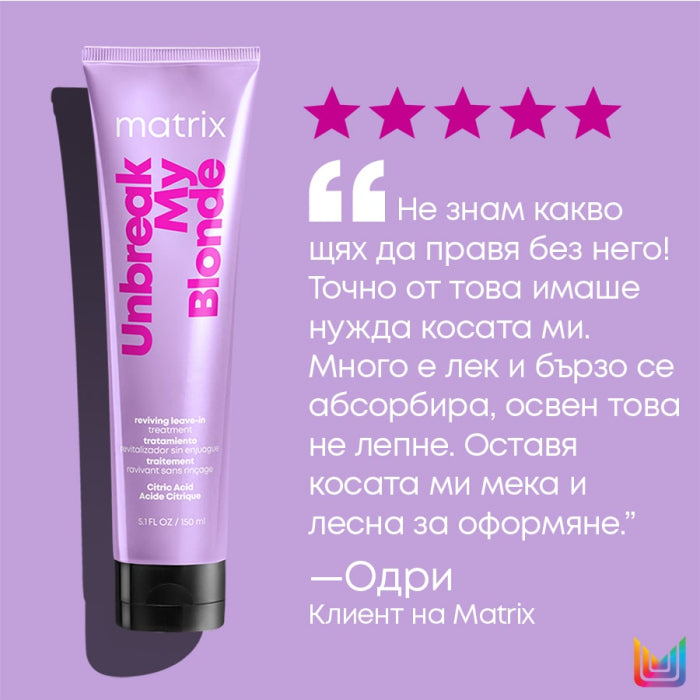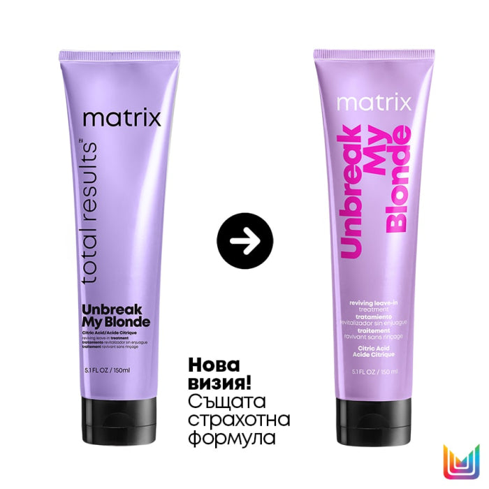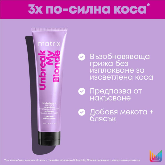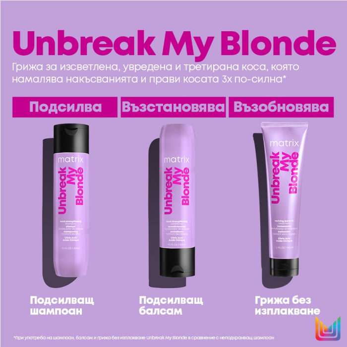 Кремът без изплакване Unbreak My Blonde е възстановяваща грижа за руса и обезцветена коса. Терапия, която подсилва изтощена и обезцветена коса, благодарение на формулата на основата на лимонена киселина, която хидратира в дълбочина и предотвратява накъсването на косъма. Подходяща грижа след обезцветяване или боядисване за поддържане на цвета.
